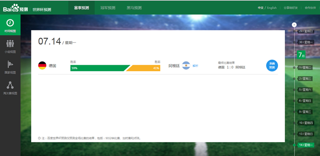 世界杯期间,谷歌、百度、微软和高盛等公司都推出了比赛结果预测平台。百度预测结果最为亮眼,预测全程64场比赛,准确率为67%,进入淘汰赛后准确率为94%。现在互联网公司取代章鱼保罗试水赛事预测也意味着未来的体育赛事会被大数据预测所掌控。
