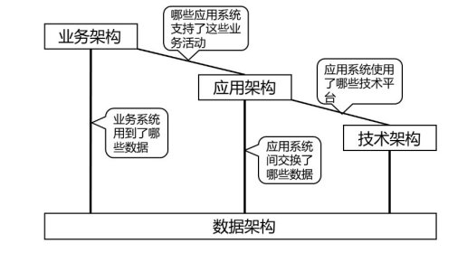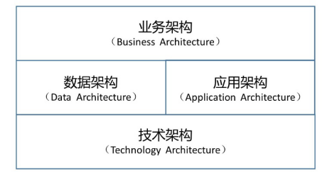 企业架构分为:业务架构、应用架构、数据架构和技术架构,见下示意图。