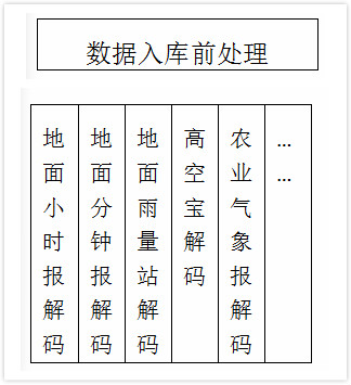 通俗地讲,应用架构就是支撑某项专业业务的具体应用系统的构成,因此应用架构总是与其所支撑的具体业务相关联的。以CIMISS系统的地面观测数据入库前处理业务为例,针对不同的观测数据种类,其入库前处理的具体应用系统有:地面小时观测报解码、地面自动站分钟雨量观测报解码、地面自动站分钟压温湿风地温观测报解码、高空探测报解码等等,见下示意图: