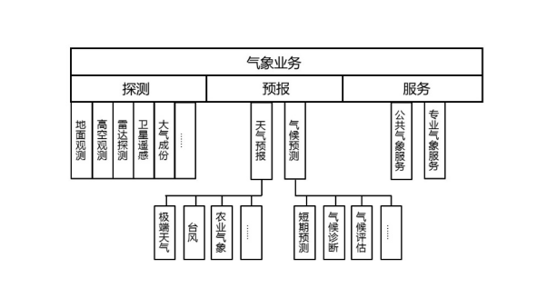 一个部门的业务架构,就是这个部门业务构成的由宏观到微观的详尽的条理化描述。如:气象部门的业务主要由观测、预报和服务三部分构成,而观测业务又由地面观测、高空观测、天气雷达观测、气象卫星观测、大气成分观测、农业气象观测等等若干种专业气象观测构成。预报业务则由天气预报、气候预测两部分专业业务构成,细分下去,天气预报专业业务又可分为:强天气预报、台风预报、农业气象预报、数值天气预报、……数个专业方向;气候预测专业业务亦可类似细分,见下示意图: