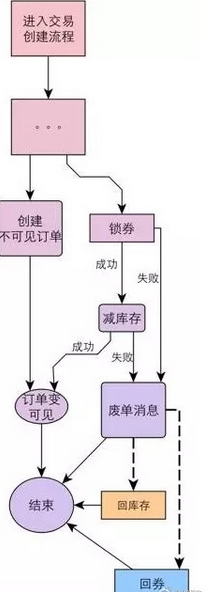 另一种方式是创建一个不可见订单,然后在同步调用锁券和扣减库存时,针对调用异常(失败或者超时),发出废单消息到MQ。如果消息发送失败,本地会做时间阶梯式的异步重试;优惠券系统和库存系统收到消息后,会进行判断是否需要做业务回滚,这样就准实时地保证了多个本地事务的最终一致性。