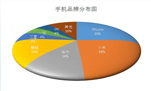 后来注意到这些点赞大部分都有显示所用的手机品牌和具体型号,这引发了我对这次意外获得的小数据做进一步分析的兴趣。经过逐条提取,终于,一份手机品牌的分布图出来了(如下图所示):iPhone手机用户最多,占比为25%;小米手机用户略低,为24%;华为和魅族都是14%。