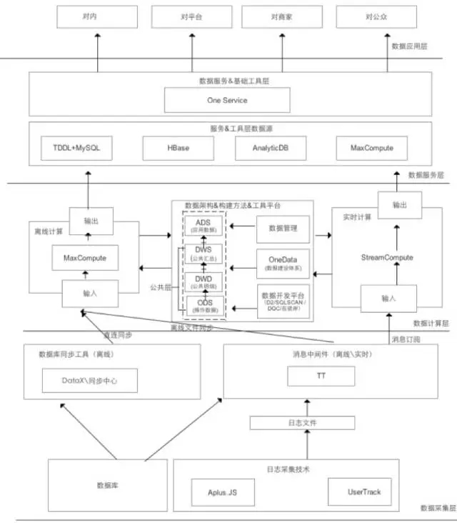 上图是阿里巴巴数据体系架构图,可以清晰地看到我们的数据体系主要分为数据采集、数据计算、数据服务和数据应用四大层次。