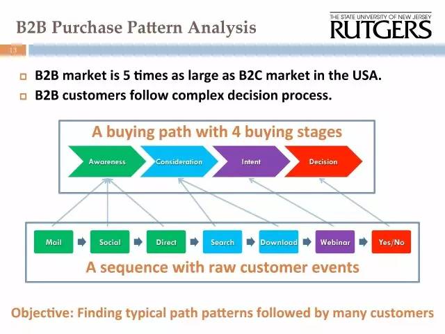 对应到我们所说的例子,因为提升ROI的关键在于,我们必须focus在那些重要的,能最终成交的客户身上,所以我们通过分析,5万个用户的节点数据,最终形成了购买的客户群,他们停留的节点,做的选择,大致就能归纳出一些规律。比如他如果到了一个节点,可能会往下做哪一步,我们可以对其保持重点关注。
