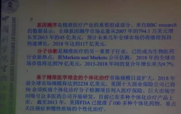 围绕精准医学概念所产生的实质性的,比方说健康设施、健康从业人员的健康领域的大的产业圈,这个产业圈估计2018年可以到达2千亿美金,这些方面都是精准医学可以带来的,可以预见的实打实的新的产业。我国精准医学的目标和上面国际的是一致和接轨的。