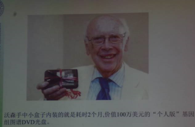 分析少。这是沃森拿着自己的遗传密码在他的小盒子里,这个时候大约是人类开展遗传密码测序的十年以后,我们知道到那个时候测序已经变得不那么昂贵了,但还需要一百万美金两个月的时间,又过了十年只需要六七千人民币,三天时间可以得到他的遗传密码,可惜的是他拿着他的小盒子自己也不知道能分析多少。