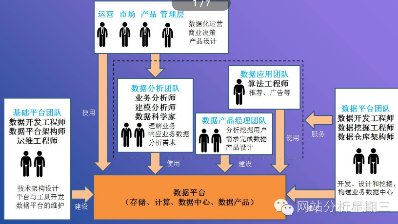 数据分析团队与产品团队、运营团队各自独立,团队的负责人具有直接向分管数据的副总裁或CEO直接汇报的权限,团队负责响应各业务部门的数据需求。