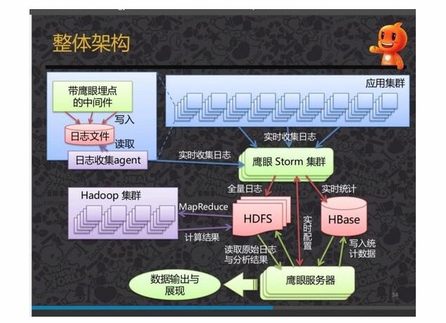 稍微说明下,日志收集Agent可以使用Flume,鹰眼Storm集群,其实就是Storm集群,当然有可能是淘宝内部Java版的,Storm(或第一幅图的SparkStreaming)做两件事情。