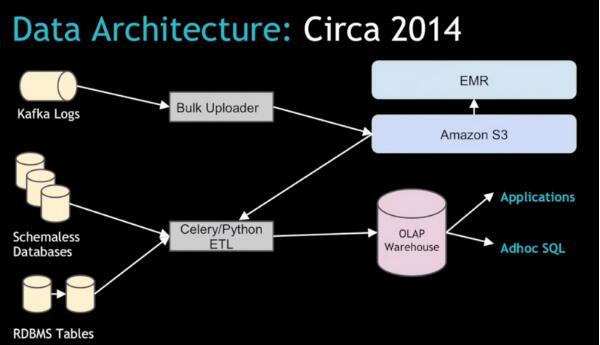 在旧的架构下,Uber依赖于Kafka的数据流将大量的日志数据传输到AWS的S3上,然后使用EMR来处理这些数据。然后再从EMR导入到可以被内部用户以及各个城市总监使用的关系型数据库中。