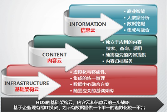 基于对云计算和大数据的深入研究,HDS提出了三步云战略,即基础架构云、内容云和信息云。三步云战略基于企业现有的IT设施,为企业的所有数据提供单一的虚拟化平台。其中基础架构云目的为提供动态基础架构,以实现支持所有数据的单一平台。而内容云则基于这一单一平台,借助智能工具,实现对所有类型数据的索引、搜索和发掘。让数据可以更容易地被发现、共享并且重新利用,因而也会变得更有价值。在信息云中,和大数据会更加关联,让各种信息分析工具和流程与底层基础架构完美集成。连接不同的数据集,揭示其中的规律,以为企业用户提供有价值的信息和商业洞察,帮助客户应对在医疗、生命科学、能源研究、社会基础设施等领域的挑战。