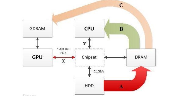 箭头A :数据从HDD传输到DRAM(CPU+GPU计算的初始步骤)