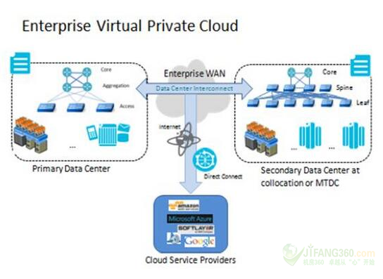 通过构建一处具备了基本服务器或存储场的企业园区的核心数据中心可以打造一款私有云,并可以通过一个本地的核心网络连接。该数据中心设施可以扩大到包括pods支持在企业数据中心的其他计算或存储功能,以扩展私有云,或远程位置的托管数据中心构建一个虚拟私有云。