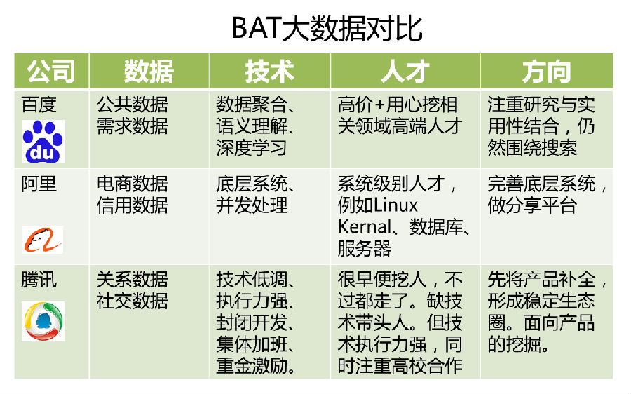 百度的优势体现在海量的数据、沉淀十多年的用户行为数据、自然语言处理能力和深度学习领域的前沿研究。在技术人才方面百度是聚集国内最多大数据相关领域顶尖人才的公司。听说百度前段时间花五千万挖了数据挖掘、自然语言处理、深度学习领域的十来位大牛,包括一些学者和教授。例如Facebook科学家徐伟。