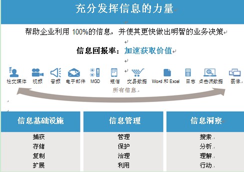 信息优化的目标为构建一个服务于整个企业,从数据安全及合规,到分析和敏捷性的统一基础设施。而由此带来的快速、轻松分析信息的能力能够帮助企业获得更可靠的视图,从而做出准确、有效的决策。