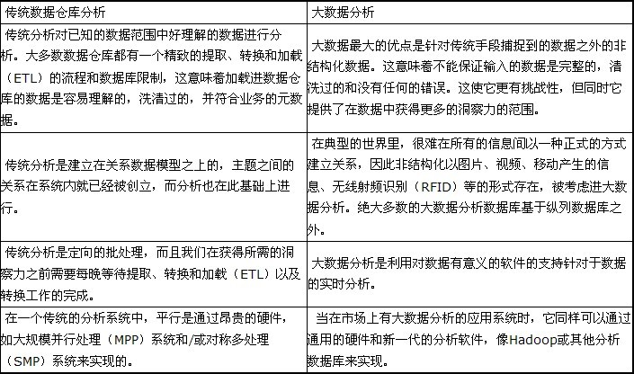 企业数据的分析朝着在一段时间内在那种内容中的信息的有意义的洞察,是大数据分析区别于传统数据仓库分析的原因所在。下表总结了一些它们之间的差别。
