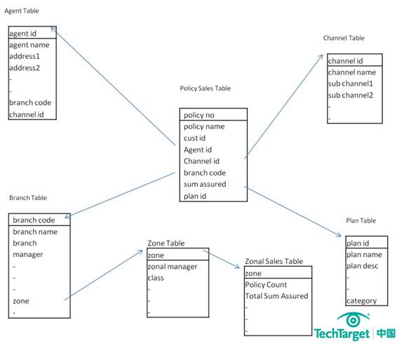 如图1所示,按照集中式事实表的设计模式,保险销售表(Policy sales)需要连接不同的维度表。如果在汇总保单(sum assured)时想要查询代理人(agent)的策略销售,那么必须“联合(join)”代理人表,才能看到包含渠道(channel)信息的代理表。如果想要查询策略的区域销售额,那么必须“联合”分销区表(branch)。