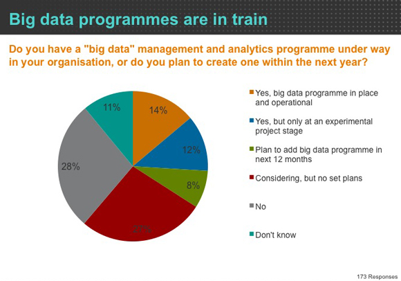 虽说大数据的使用还处于初级阶段,但27%的计划增长率足以让人对其刮目相看。23%的参与者已经不同程度地部署了大数据项目。