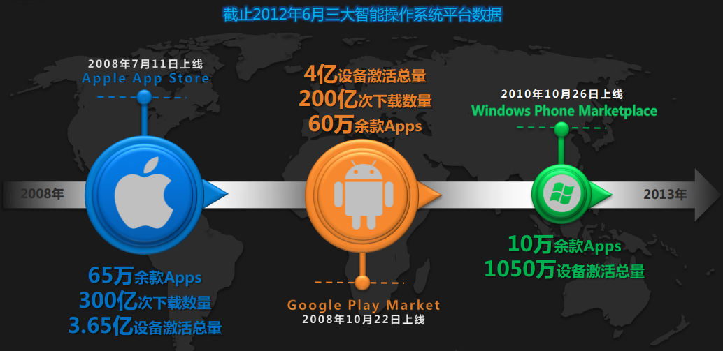 截止2012年6月,中国有网民5.38亿,其中手机网民达到3.88亿。同时关于三大移动智能操作系统,我们还得到这样一组数据: