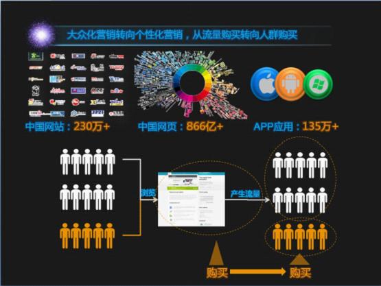 DCCI提供的数据显示,中国有超过230万个网站,网页超866亿,移动应用超过135万。由此可以预见,国内网络广投放也将从传统面向群体的营销转向个性化营销,从流量购买转向人群购买。也就是说,未来的市场将更多地以人为中心,主动迎合用户需求。