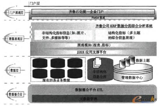 数据整合层:以建立齐鲁石化的指标信息元数据为标准,以此为基础规范编码标准、数据接口和信息结构。依托整合工具ETL进行数据提取、过滤、清洗、装载过程,建立指标信息共享数据库。[page] 数据层:主要分为3类数据,其一为现有的业务数据,其二为非结构化信息仓库,其三为指标管理数据中心。通过信息采集、手工录入的方法,形成针对非结构化数据的信息仓库。在展现时候。要考虑到结构化的管理信息和非结构化的文档类信息之间的关联,实现两者之间的关联检索机制。在建立效据中心过程中,需要充分考虑到未来信息化应用产生的数据,应方便、高效地集成到指标数据中心。