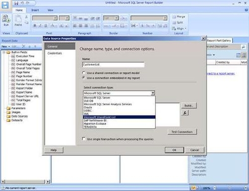 若 要在报表中使用从 SharePoint 列表获取的数据,首先需要创建数据源,然后创建使用该数据源的数据集。在 Report Builder 3.0 中,“数据源属性”页面上有一种新的连接类型,称为“Microsoft SharePoint 列表”,如图 3 所示。除了此选项之外,您还要输入 SharePoint 站点的 URL(无需在 URL 中添加 lists.asmx)。还可为数据源配置在访问 SharePoint 服务器时使用的不同凭据。