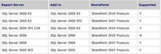 图 5 支持的 SharePoint 外接程序和报表服务器的组合