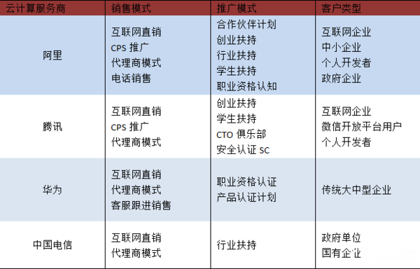 不难发现,不同阵营的云计算厂商在销售模式上大同小异,但在推广模式和客户类型上出现了不同的思维,阿里和腾讯表现出了典型的互联网思维。