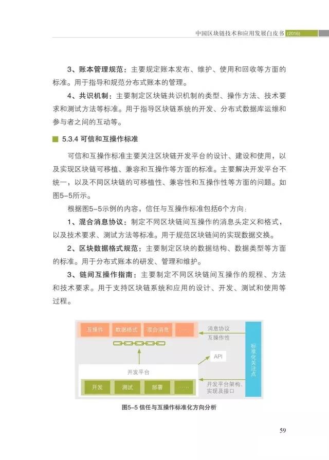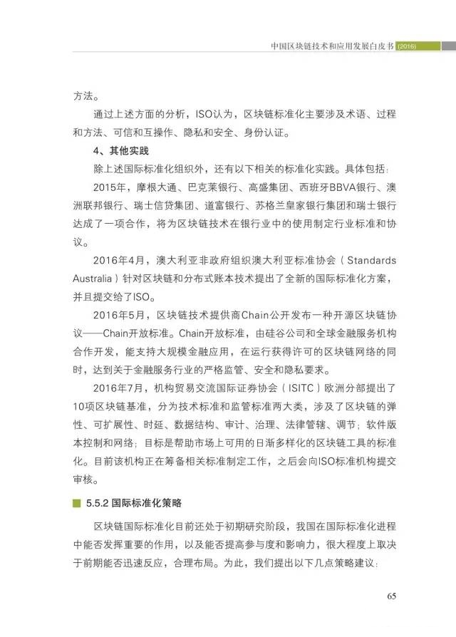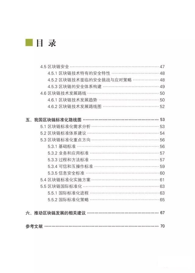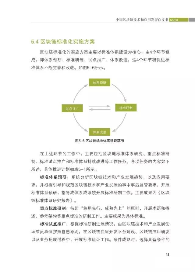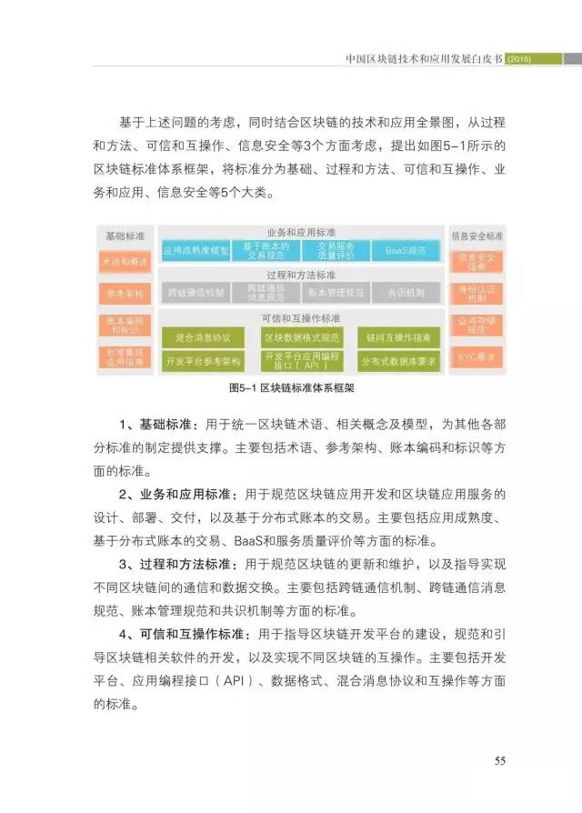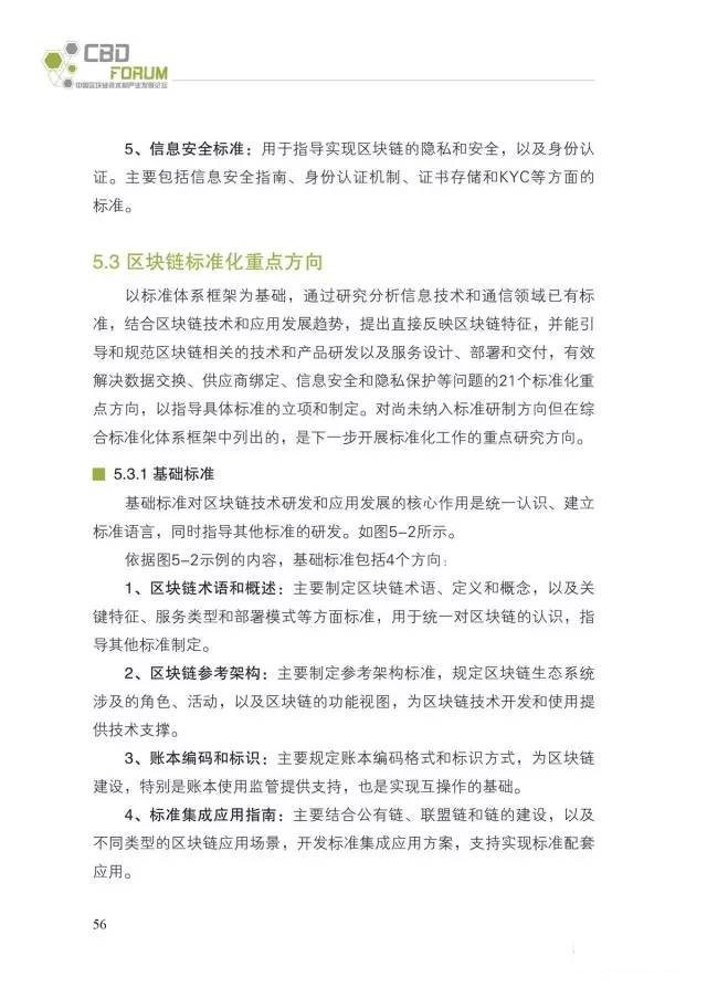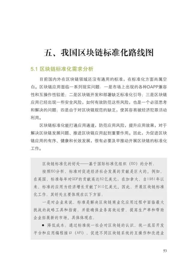 四是首次提出我国区块链标准化路线图。结合区块链应用场景和技术架构,提出区块链标准体系框架建议。通过分析国际标准化发展趋势,以及区块链技术和应用发展需求,提出了基础、业务和应用、过程和方法、可信和互操作、信息安全等5类标准,并初步明确了21个标准化重点方向和未来一段时间内的标准化方案。