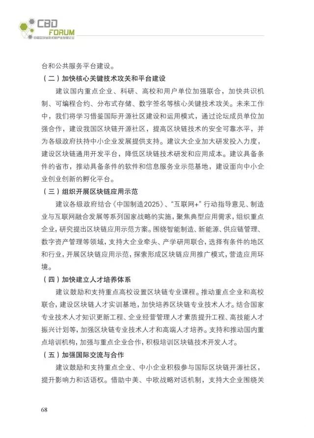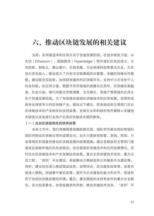 最后,基于对全球区块链发展趋势的研判,以及我国区块链技术和应用发展的现状和趋势,围绕扶持政策、技术攻关和平台建设、应用示范等方面提出了相关建议。