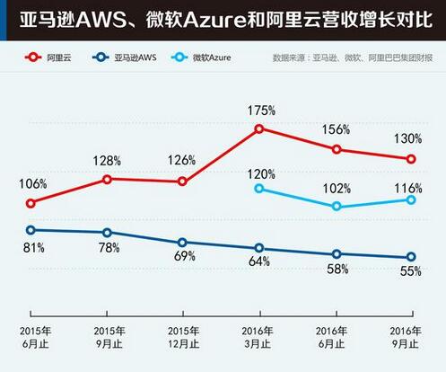 事实上,阿里云的增长并不「孤单」,自 2015 年下半年开始,全球云计算市场所爆发出的增长势头令人惊艳。而仅以当前三大玩家阿里云、亚马逊 AWS、微软 Azure 在过去一年半的表现为例,下面的这个增长曲线非常惊人: