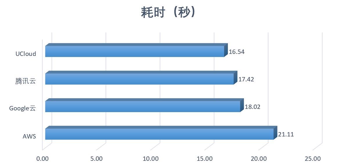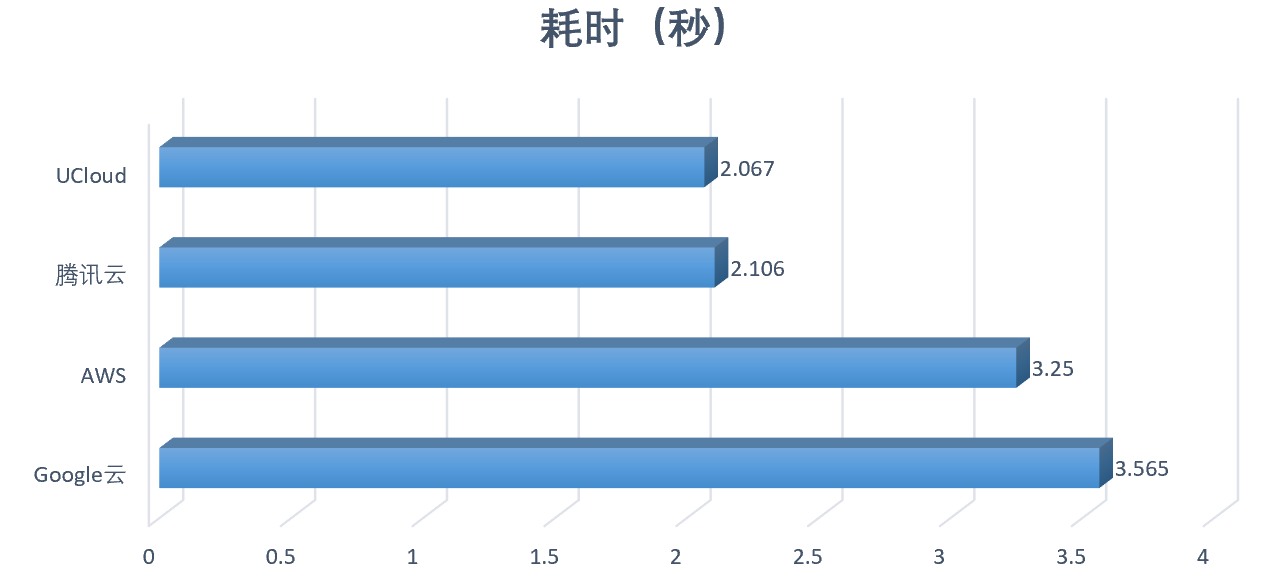 根据上图可以看出,UCloud耗时最短为2.067秒,与紧随其后的腾讯云差距不是很大,但Google云耗时最长,且UCloud最终耗时比Google云可降低大约42%。