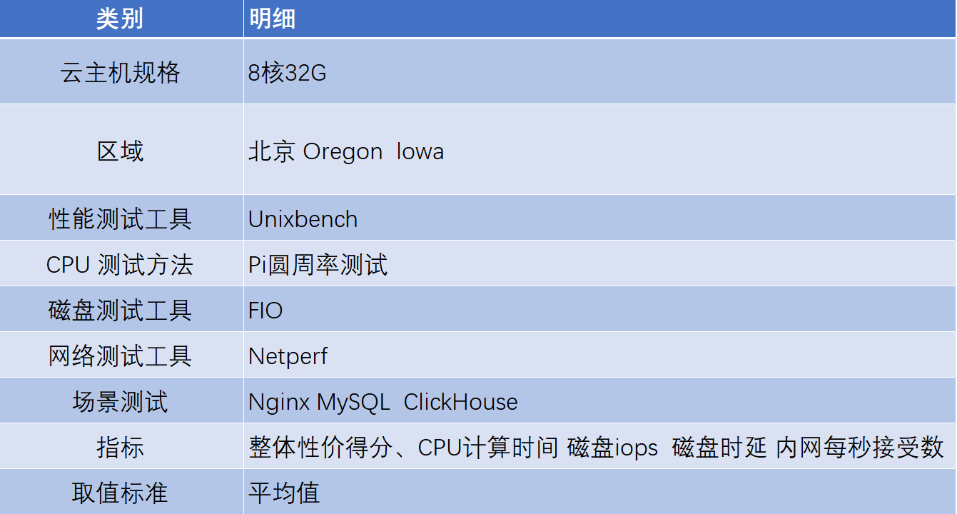 本次测试主要利用Unixbench性能测试工具、Pi圆周率测试、FIO、Netperf等测试方法,对云主机的CPU性能、磁盘性能和内网质量等分别进行测试,此外还针对Nginx、MySQL、ClickHouse三种常见的应用场景做了测试比较。