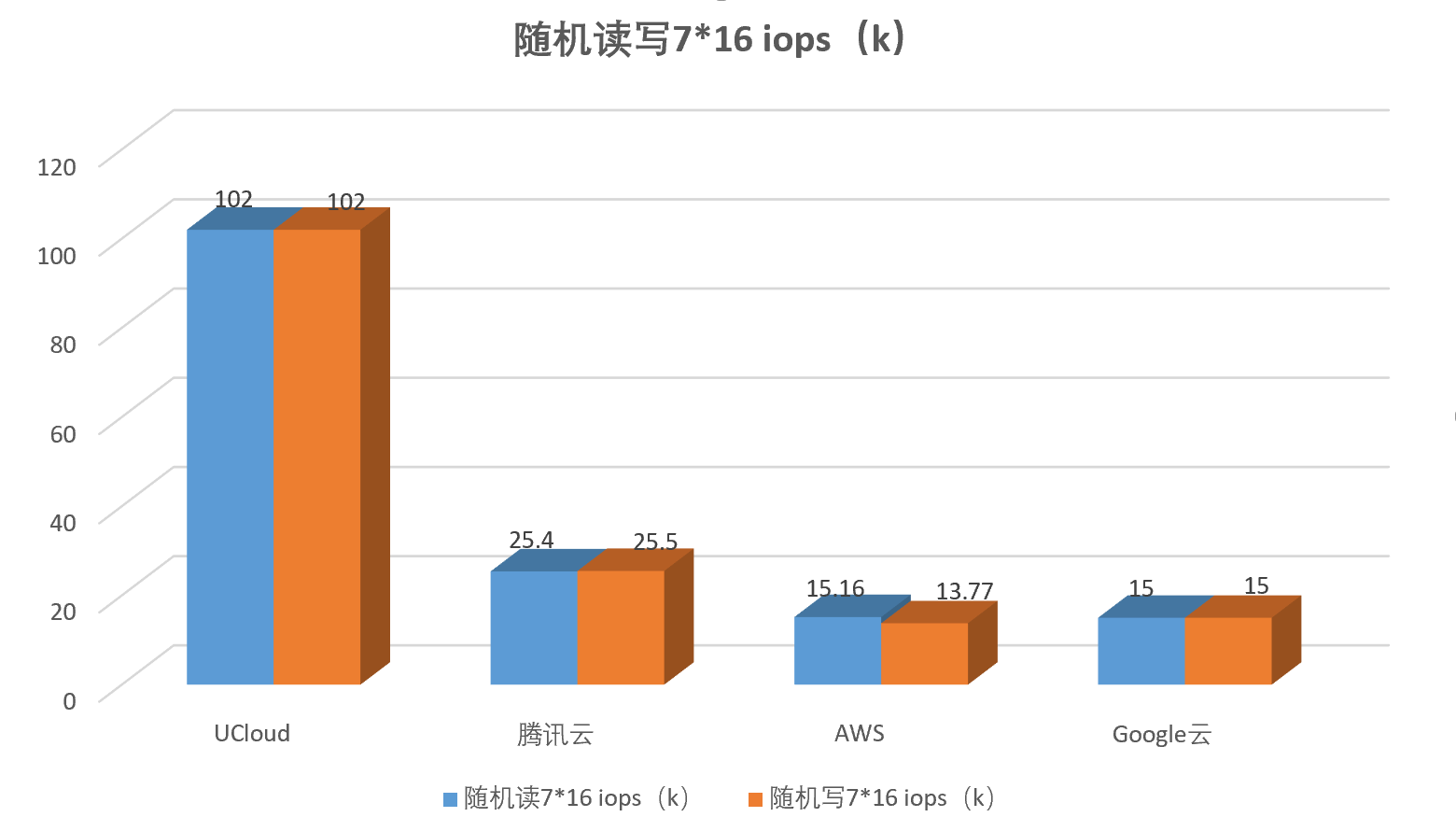 由数据图表可见,在队列深度1*1和7*16时,UCloud的IOPS和平均时延都具有明显优势,而其他三家相差不大。在队列深度为1*1时,UCloud随机读的数量是排名第二的AWS的2.5倍,而随机写的数量更是比排名靠后的腾讯云高出10倍。在队列深度为7*16时,UCloud随机读写能力依然表现突出,是排名第二的腾讯云的4倍,AWS和Google云比较接近,均不太理想。