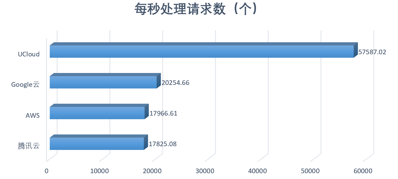 上图是我们根据ab压测请求数200万,一次并发请求数为500得出的平均数据,很明显可以看出UCloud在这次压力测试下,各项指标均表现最佳,远超出其他云平台。在每秒处理请求数上,UCloud高出腾讯云2倍, Google云、AWS、腾讯云分别位居第二、三、四位;在单请求耗时和测试耗时方面,UCloud也仅占其他三家的1/3左右时长。