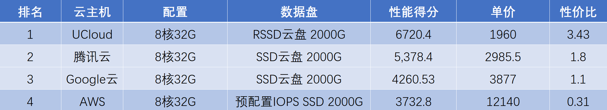根据上图数据,我们可以明显看出UCloud的性价比最高为3.43,腾讯云排名第二为1.8,Google云排名第三为1.1,而AWS性价比最低仅有0.31。由此可见,UCloud性价比也远超其他三家,经计算,UCloud性价比大约是排名第二的腾讯云的1.9倍,甚至比国外AWS高出10倍。也就是说花同样的价钱,选择UCloud 快杰型AMD云主机可以收获最高的性能体验。