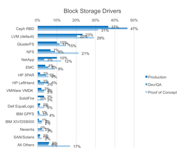 OpenStack是开放且允许多种存储方案供用户自由选择的。OpenStack对存储的关键诉求是横向扩展,能提供海量存储容量,因而软件定义存储(SDS)是最有价值的解决方案。Ceph是目前受到认可的软件定义块存储解决方案(请参考OpenStack User Group公开调查http://superuser.openstack.org/articles/openstack-user-survey-insights-november-2014)。红帽是Ceph主线维护者,参与并制定Ceph下一步发展计划,其Ceph企业发行版(ICE)达到企业商用要求。