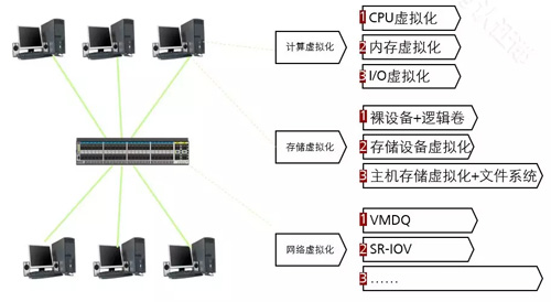 虚拟化主要内容包含三个方面的内容:计算虚拟化、存储虚拟化和网络虚拟化。