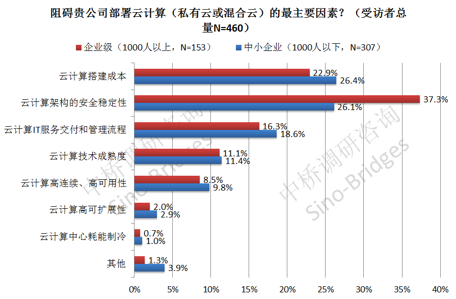 不同企业规模对阻碍云计算部署的排序有所不同(图3)。对于企业级用户,排在第一的是云计算业务稳定性和安全性,比例高达37.3%.其次是,云计算搭建成本(22.9%)。企业级用户在云计算部署评估过程中,云计算环境下业务安全稳定性的战略价值远高出成本和经济性。对于中小企业,26.4%认为云计算搭建成本是阻碍云计算部署的首要因素,26.1%认为云计算业务稳定性和安全性是云计算部署第二大阻碍。中小企业评估云计算部署的过程中,往往会同时从开支和安全稳定性两个方面来权衡技术和方案。