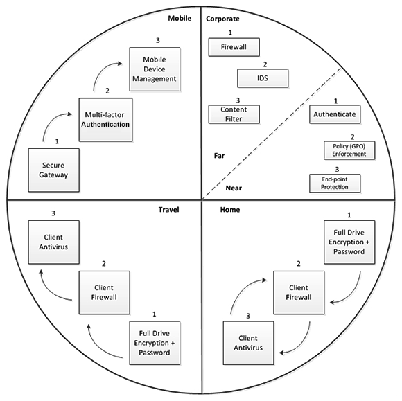 随着BYOD运动不断发展,企业也期望员工通过智能手机和平板电脑远程进行连接,至少可以查看公司电子邮件,尽管通过类似Salesforce.com这样的基于云的应用的风险,通常意味着员工在移动设备上进行更为复杂的任务,涉及很多类型的数据。这也代表了另一种用例,同样地这种设备也会被认为不受管理。通过移动劳动力,企业应该安全运作,并期望每一个用户至少有四种不同的用例:办公室、家庭、旅行和个人移动设备。