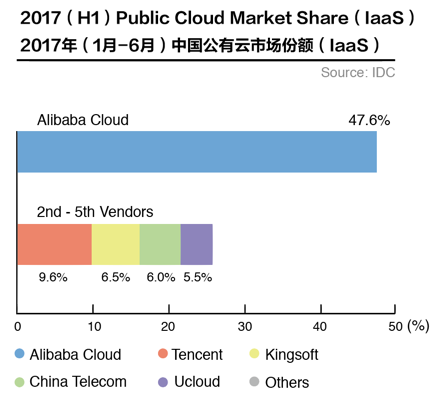 11月1日,权威研究机构IDC发布了2017年上半年中国公共云IaaS市场份额调研结果,阿里云市场份额比2016年底上升7个百分点,市场份额扩大至47.6%,领先优势不断扩大。同期,市场第2至5位云服务商市场份额分别为9.6%、6.5%、6%和5.5%。