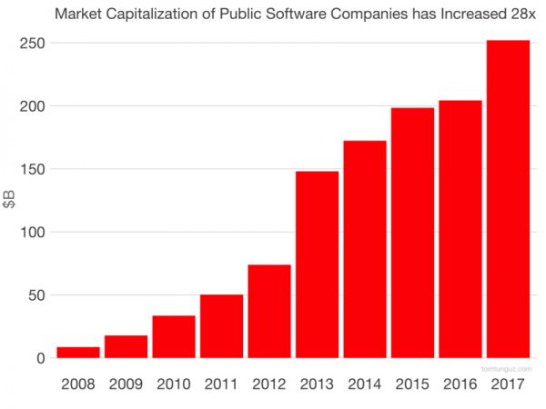 其次,上市 SaaS 公司的市值在过去十年时间里增长了 28 倍。考虑到过去几年数百亿美元的收购交易(例如微软 260 亿美元收购 LinkedIn、甲骨文 93 亿美元收购 Netsuite 以及 SAP 83 亿美元收购Concur),就更加令人感觉惊讶。除此之外,还有私募股权公司的一些私有化收购交易,例如 Vista 以近 18 亿美元收购 Marketo 以及 16.5 亿美元收购 Cvent 等。其余公司的市值已经增长到足以抵消和超过私人持股业务贡献的程度。