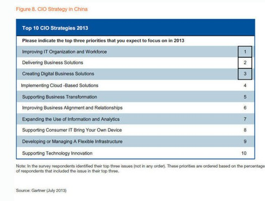 而截至2013年的统计,国内CIO战略优先等级排在前三位的分别为改善IT部门人员队伍、数字业务解决方案和交付业务解决方案三方面。