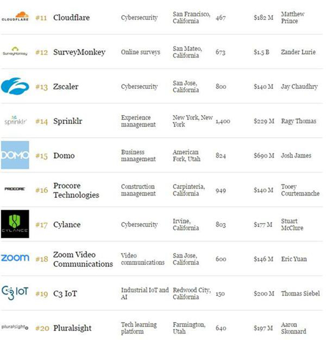 这次的榜单收录了25家2016年榜单中没出现过的企业,其中较为出色的是二次物联网应用软件公司C3 IoT(排名19),它能帮助处理航空、能源、制造业等大企业的大量数据。