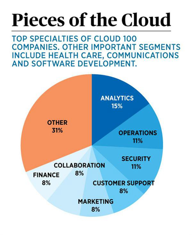 数据与分析公司是入榜最多的企业类别,占15%。犹他州经验管理领导企业Qualtrics(排名第6)是其中佼佼者。尽管人口不到湾区和纽约的一半,犹他州新兴的云端前景却势头看涨,有6家企业出现在榜单上。