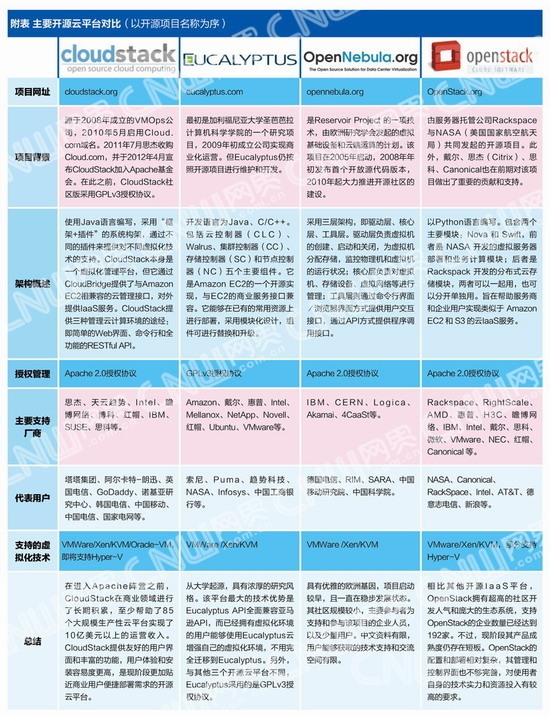 尽管OpenStack和CloudStack的较量聚集了太多关注的目光,但这一市场还有其他重要的参与者。相比影响力相对有限的oVirt,Eucalyptus和OpenNebula是两个不可被忽视的开源云平台项目。目前,这两个项目也拥有自己的生态系统,以及忠实的开发者群体。对中国企业而言尤为重要的是,Eucalyptus和OpenNebula在中国市场均拥有重量级的企业用户。笔者特别对目前四大主要开源云平台进行了对比,具体如附表所示(以开源项目名称为序)。