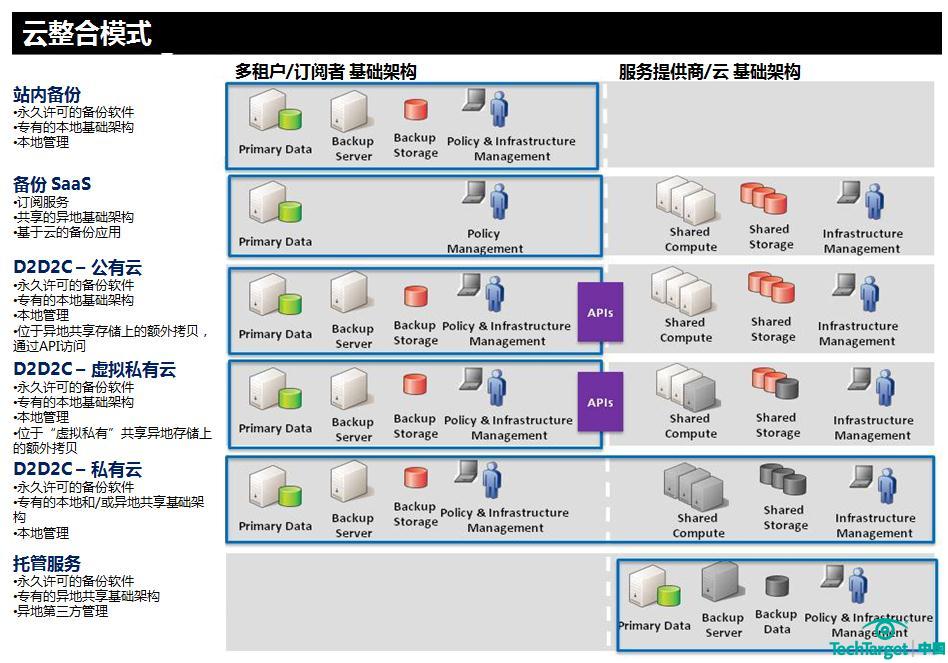 对于备份和恢复功能,有众多的云整合方式可以使用(参见“云备份整合模式”)。其中一个可以完全免除备份基础架构的方法是备份软件即服务(SaaS),包含在云中运行备份应用和存储备份拷贝。另外一种免除基础架构的方法是将IT服务外包给管理服务提供商(MSP),允许MSP托管生产应用和管理IT基础架构,包括备份和恢复操作。通过磁盘到磁盘到云(D2D2C),还有很多方法可以使用云来整合企业内部的备份功能,如:利用公有云基础架构即服务,在公有云环境中创建虚拟私有云或建立私有云基础架构。