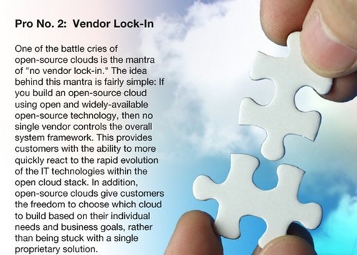 开源云的一大宣扬口号是“无厂商锁定”。这个口头禅的背后蕴含的 道理很浅显:如果你建立一个开放和广泛使用的开源技术云计算,就 不再有某个单一的供应商控制系统整体框架。为客户带来了更快的适应IT技术开源云快速发展的能力。此外,开源云给客户提供了根据各 自需求和业务目标的资源选择,而不是一个单一的专有解决方案与云方案锁定。