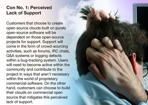 选择创建开源云来构建完整的开源软件将会依赖这些开源项目。这种支持可能会以论坛、IRC聊天、Q&A系统或者bug跟踪系统等形式出现 。用户需要在社区内积极主动,成为活跃分子,并有助于该项目的推进而不是朝向商业软件的方向发展。