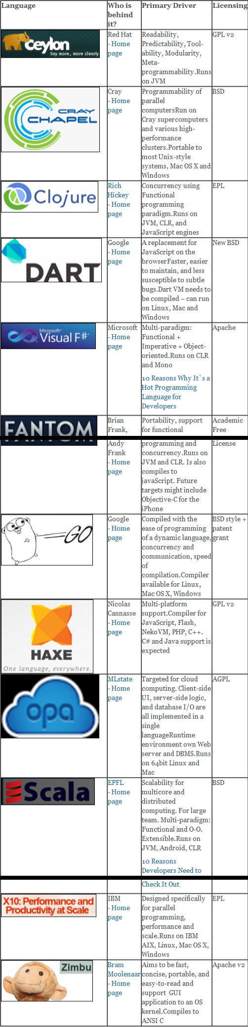 可用于并行计算的编程语言(Cray的Chapel、IBM的X10)、并发编程(Clojure,Fantom,Go)和完整云栈单语言(Opa)。