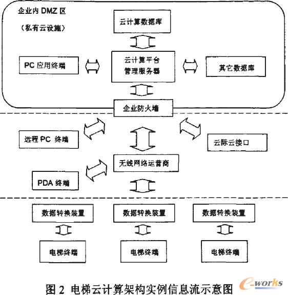 随着电梯产能和在用电梯基数的不断扩大,各电梯厂商纷纷采用数据库管理生产、销售、维保等数据。一些厂家已投入到整合企业内部服务器资源搭建电梯云计算架构的应用研究中。图2是某企业的电梯云计算架构信息流示意图。